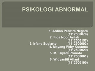 Dokumen ini membahas mengenai abnormal psikologi, termasuk definisi, model, dan penyebabnya, serta berbagai tipe gangguan mental seperti psikhopat, psikhoneurosa, dan psikhosa. Selain itu, dibahas juga abnormalitas seksual, penyebab gangguan mental, dan usaha preventif untuk mengatasi defek mental. Informasi disajikan dengan rincian mengenai penggolongan dan ciri-ciri gangguan, mencakup penjelasan tentang faktor biologis, psikososial, dan sosiokultural yang mempengaruhi kesehatan mental.