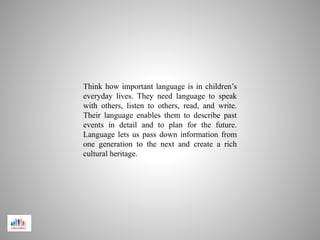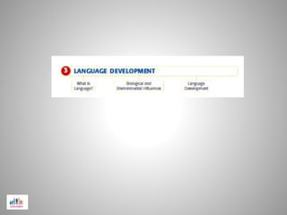 Language is a system of communication using symbols governed by rules. It involves five rule-based systems: phonology (sounds), morphology (word forms), syntax (sentence structure), semantics (meaning), and pragmatics (appropriate use). Language develops through biological predispositions interacting with the environment, with children acquiring specific skills like multi-word sentences at different ages as they progress from infancy to adolescence.
