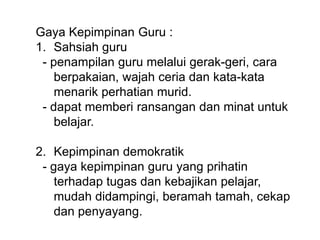 Dokumen ini membahas psikososial yang berkaitan dengan hubungan individu dalam proses pembelajaran, dipengaruhi oleh gaya kepimpinan guru, suasana kondusif, dan komunikasi berkesan. Gaya kepimpinan yang demokratik dan suasana kelas yang menyenangkan mendorong interaksi dan minat murid, sementara komunikasi yang baik membentuk budaya penyayang. Keseluruhan, guru yang efektif dapat meningkatkan aspek sosial dan psikososial dalam pembelajaran.