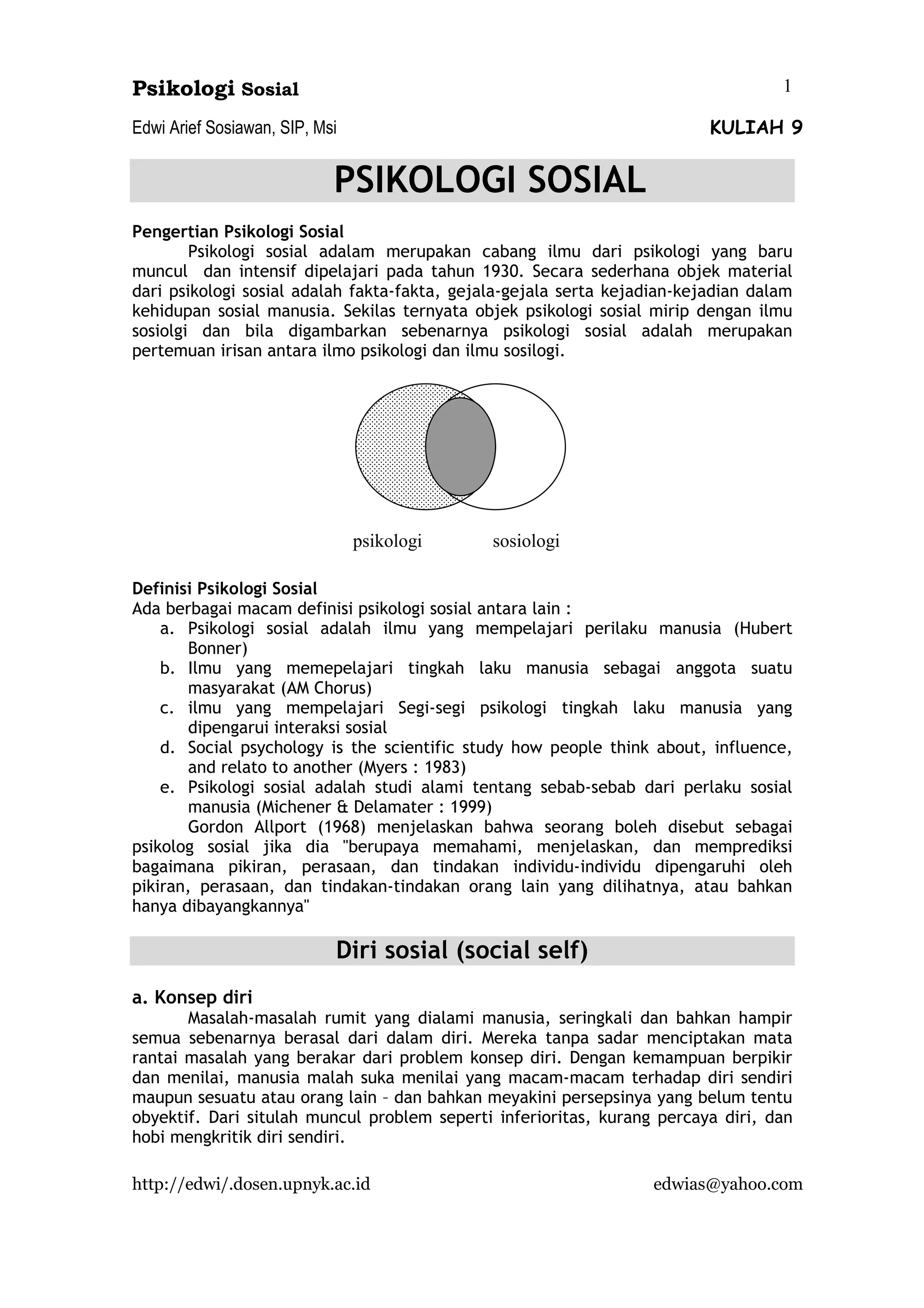 Dokumen ini membahas pengertian dan konsep psikologi sosial, termasuk definisi, konsep diri, serta faktor-faktor yang mempengaruhi pembentukan konsep diri individu. Penekanan diberikan pada bagaimana interaksi sosial dan pengalaman lingkungan berperan penting dalam pembentukan persepsi diri, yang dapat berdampak pada kepercayaan diri dan cara berkomunikasi. Selain itu, dijelaskan tentang pentingnya memiliki konsep diri yang positif untuk meningkatkan interaksi sosial yang lebih baik.