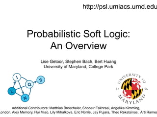 Probabilistic Soft Logic (PSL) is a declarative language for expressing collective probabilistic inference problems. PSL uses predicates, atoms, rules, and sets to define relationships and constraints between entities. A PSL program consists of a set of rules and an input database. PSL can be used for tasks like entity resolution and link prediction by expressing evidence through rules and performing probabilistic inference. Inference in PSL finds the most probable explanation for unknown atoms by minimizing a hinge-loss objective using an alternating direction method of multipliers algorithm. This scalable algorithm optimizes local copies of variables in parallel.