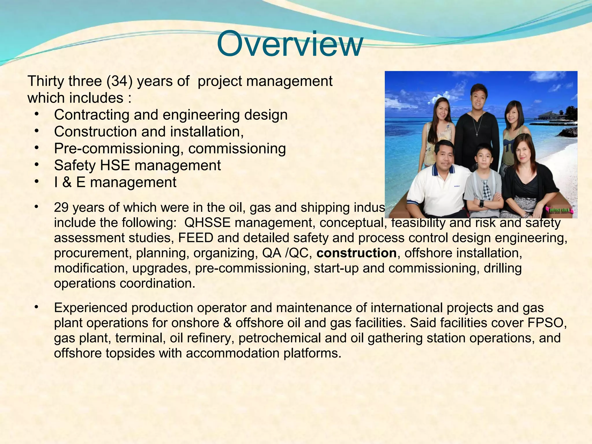 Patrick S. Muga has over 33 years of experience in project management, engineering, construction, and commissioning of oil and gas facilities. He has led multi-disciplinary teams on projects in several countries. Some of his responsibilities have included safety management, budget control, contract administration, and ensuring compliance with regulations. He also has experience training engineers and technicians in instrumentation, safety, and project management.