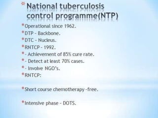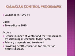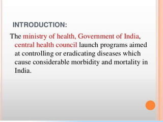 - The National Vector Borne Diseases Control Programme and other disease-specific programs like tuberculosis, leprosy, AIDS, and blindness prevention.