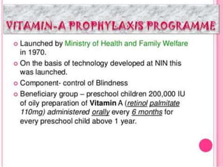 - Nutrition programs like the Mid Day Meal Programme and National Iodine Deficiency Disorders Control Programme.
