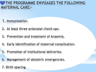 - Child and mother health programs like the Integrated Child Development Services and National Reproductive and Child Health Programme.
