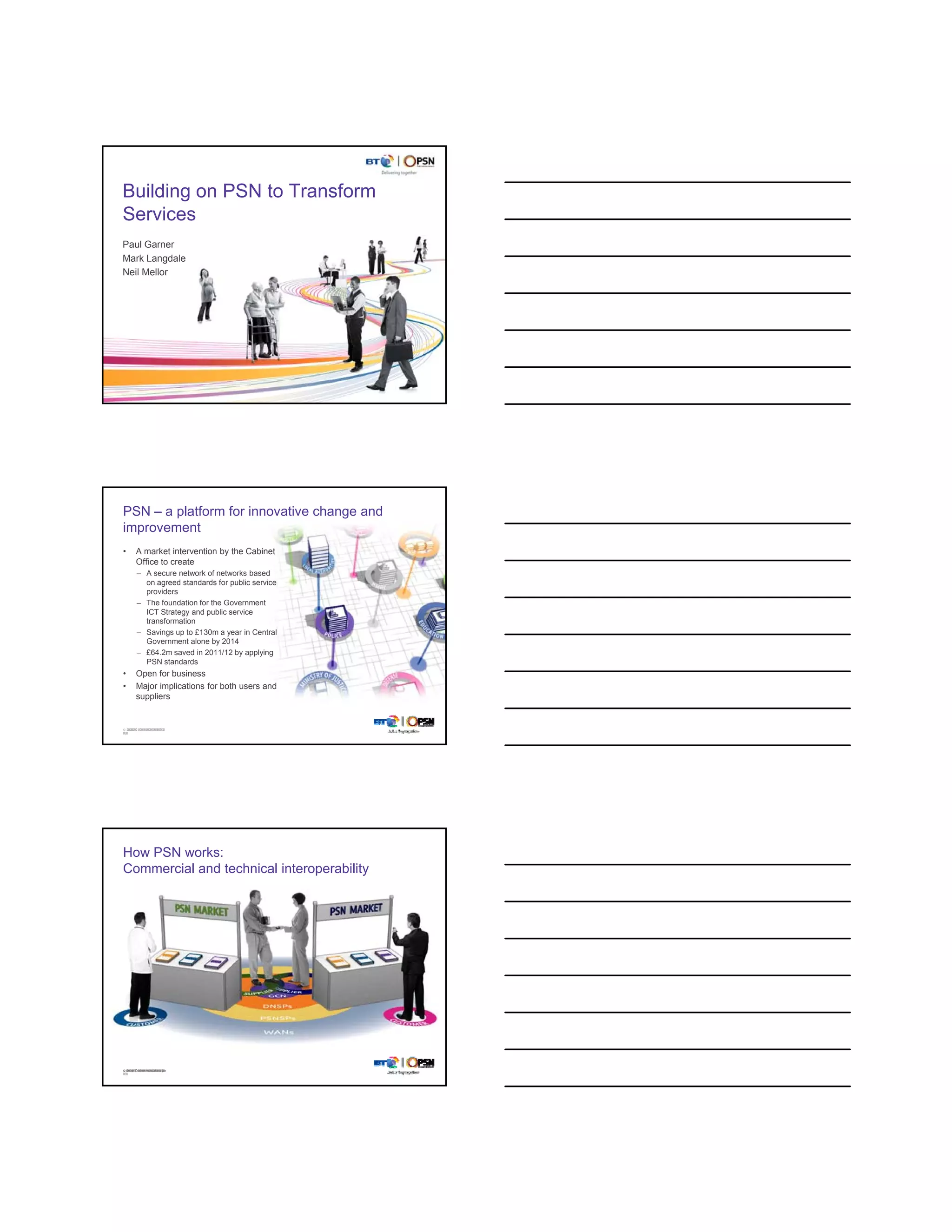 The Public Services Network (PSN) aims to transform public services by creating a secure and standardized network of networks, which is expected to save significant costs, including £130 million annually by 2014. It emphasizes innovation in service delivery by fostering collaboration across sectors and exploring new technologies, enhancing efficiency and customer service. Initiatives such as the BT Innovation Exchange and collaboration with local councils like Surrey County Council exemplify the efforts to centralize public services and achieve cost reductions through shared networks.
