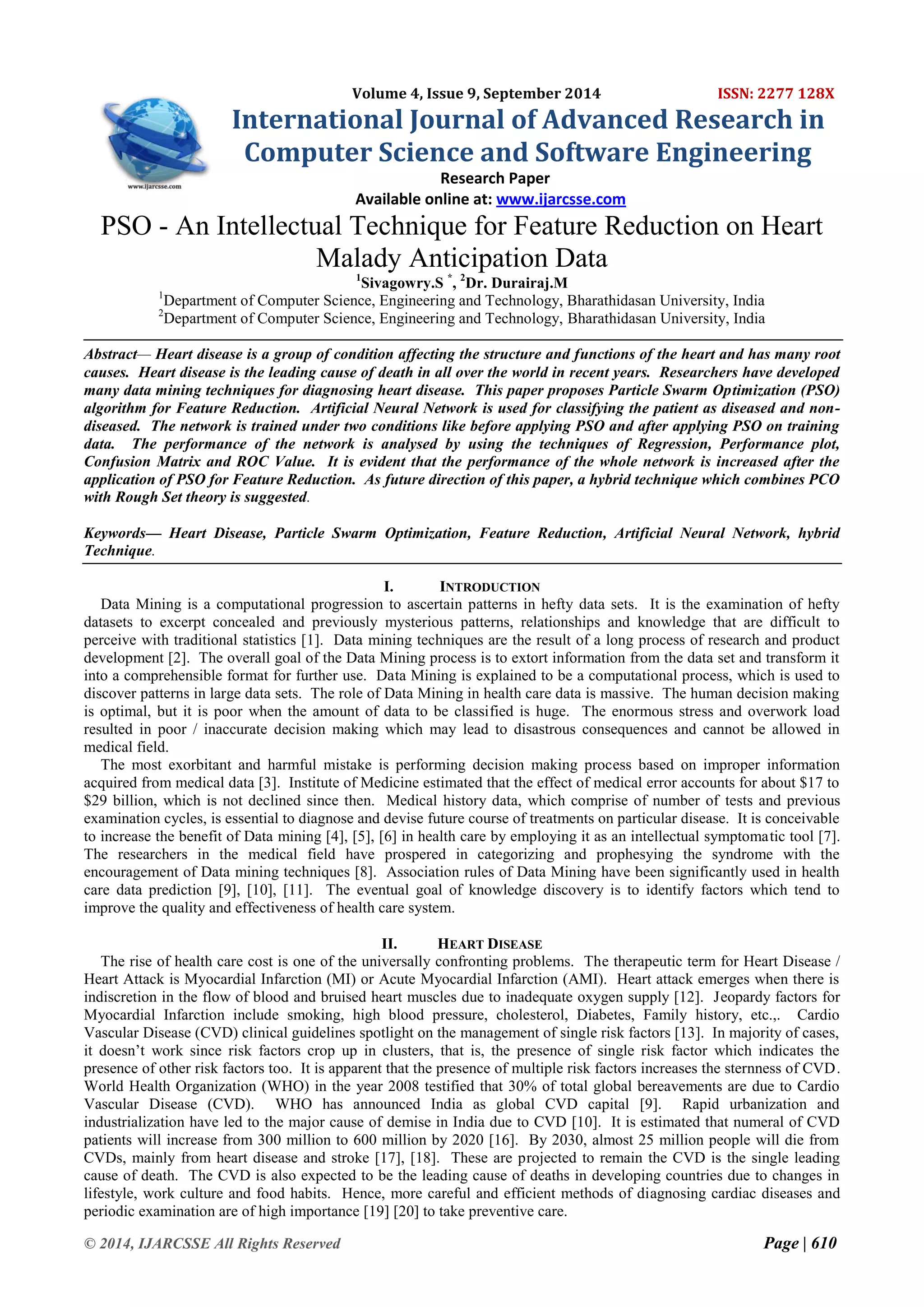 The paper presents a method utilizing Particle Swarm Optimization (PSO) for feature reduction in heart disease prediction, leveraging artificial neural networks to classify patients as diseased or non-diseased. The results indicate that applying PSO enhances the network's performance, and future work suggests a hybrid approach integrating PSO with rough set theory. The study highlights the critical role of data mining techniques in improving healthcare outcomes related to heart disease diagnosis.