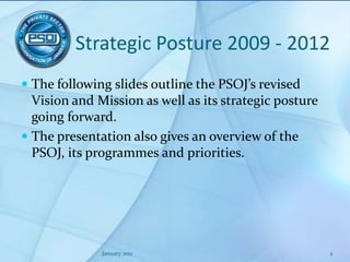 The PSOJ outlines its revised vision, mission, and strategic priorities for 2011-2012 in promoting strong private sector-led economic growth in Jamaica. Its mission is to advocate for policies that enable sustainable growth, and its vision is for Jamaica to be the best place to live and do business by 2030. The PSOJ's strategic focus areas are promoting cooperation between private sector organizations, formulating economic and social policies, and promoting transparency in government. It provides various services and benefits to its corporate and association members.