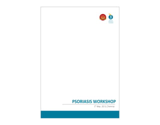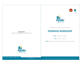 The document announces a CME programme on psoriasis to be held on May 5th, 2013 at the Hotel Raintree in Chennai, India. The programme will run from 10:00am to 3:30pm and will include sessions on the immunopathogenesis, comorbidities, varieties of psoriasis, management of psoriatic arthritis, aggressive treatment of psoriasis, paediatric psoriasis, and challenges in conventional treatment. CME credit points will be provided and the event is being organized by Janssen Immunology.