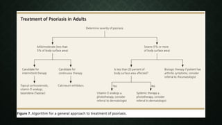 The patient, a 52-year-old male smoker with a history of alcoholic cirrhosis, presented with a widespread pruritic rash involving 70% of his body consistent with erythrodermic psoriasis. As the family physician's roles include making an accurate clinical diagnosis of psoriasis, taking a holistic approach to management, educating patients, and knowing treatment options including when referral is needed, the physician must determine the appropriate management for this severe case of erythrodermic psoriasis.