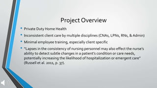 The document summarizes a client care conference project aimed at improving consistency of care for a private duty home health client. The project goals were to improve consistency of care and client outcomes by April 17th through staff collaboration, education, and implementing a new care conference policy. A client care conference was held where materials were presented to staff and administration. Results included continued use of a new client tracking tool, a new clinical educator position, and consideration of a policy change to implement care team meetings agency wide.