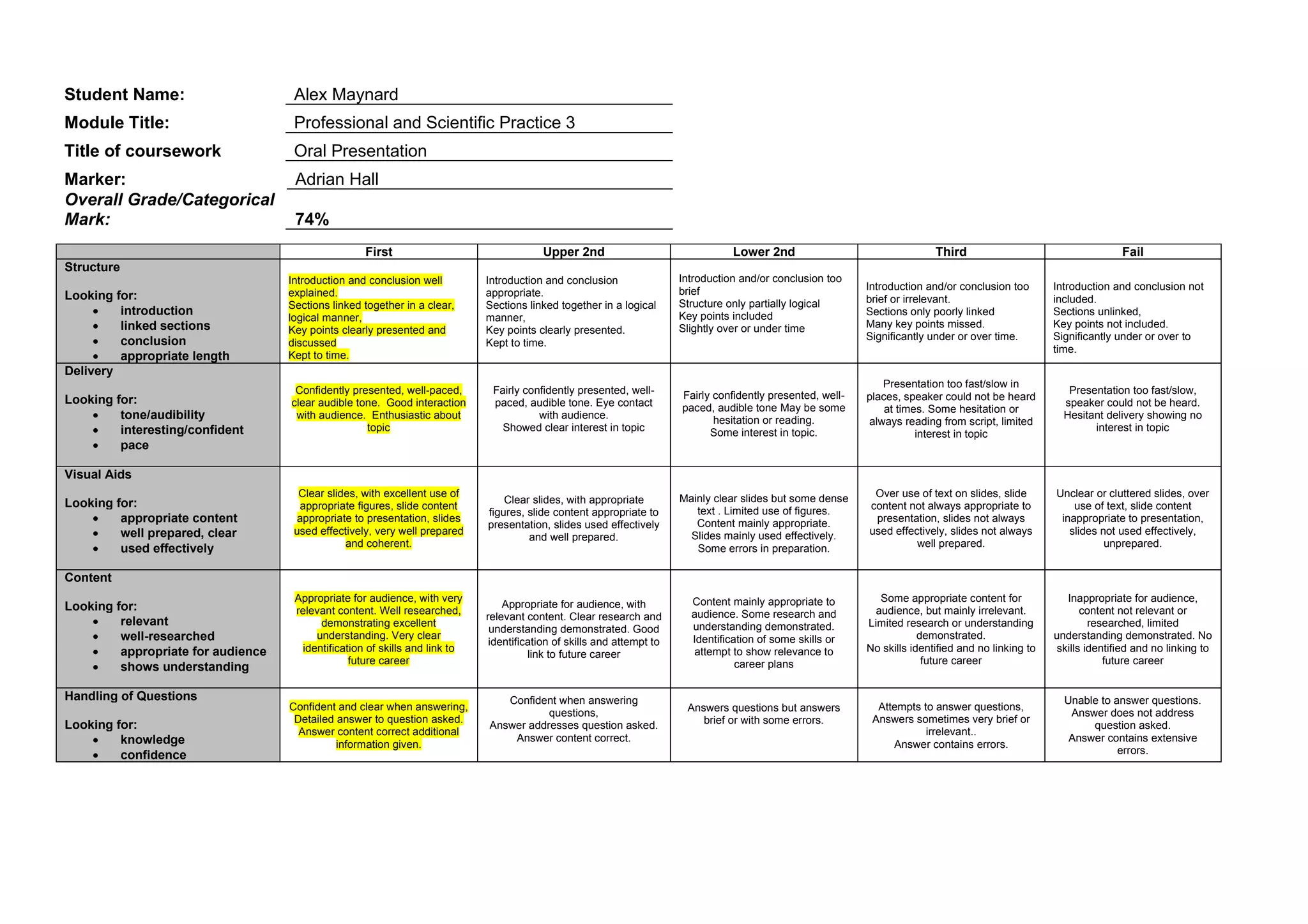 This document contains details of a student's oral presentation assessment. It includes the student's name, module and presentation title, as well as the overall grade of 74%, placing the work in the upper second classification.