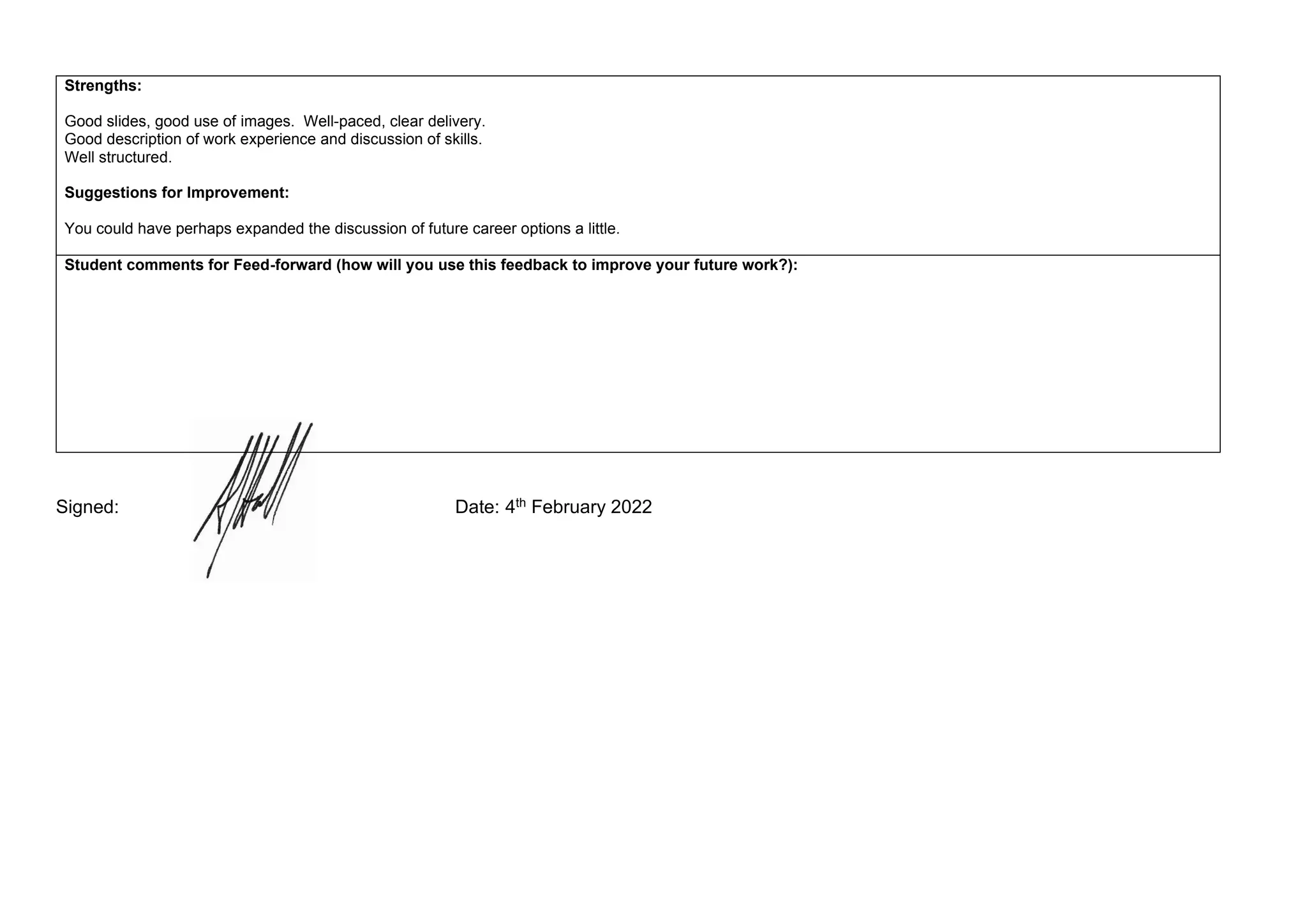 Feedback on the student's presentation notes their good slides, clear delivery, well-paced structure and description of work experience. A suggestion is made to expand future career discussion. The student is asked to comment on how they will use the feedback.