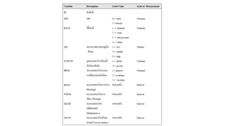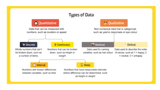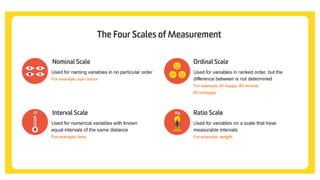 - Descriptive statistics such as measures of central tendency (mean, median, mode), measures of dispersion (range, variance, standard deviation), and data displays (frequency tables, bar charts, pie charts, histograms)