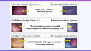 Документ описывает применение фотодинамической терапии (ФДТ) для лечения рака мочеполовой системы, включая рак мочевого пузыря, шейки матки и вульвы. Описаны показания, методы диагностики и эффективность ФДТ по сравнению с традиционными подходами, с акцентом на снижение рецидивов и улучшение результатов лечения. ФДТ продемонстрировала высокую чувствительность и специфичность, а также отсутствие побочных эффектов у пациентов.