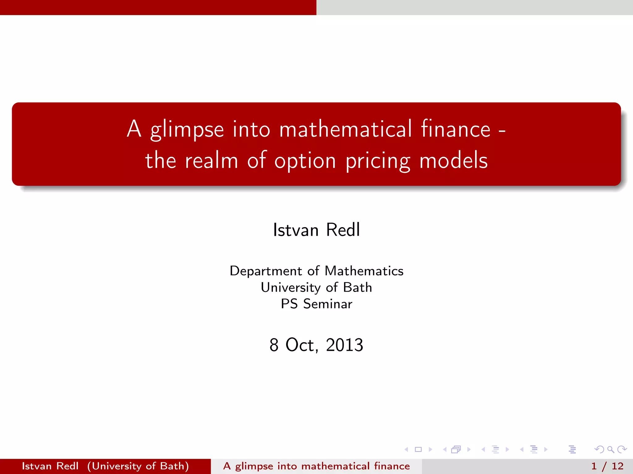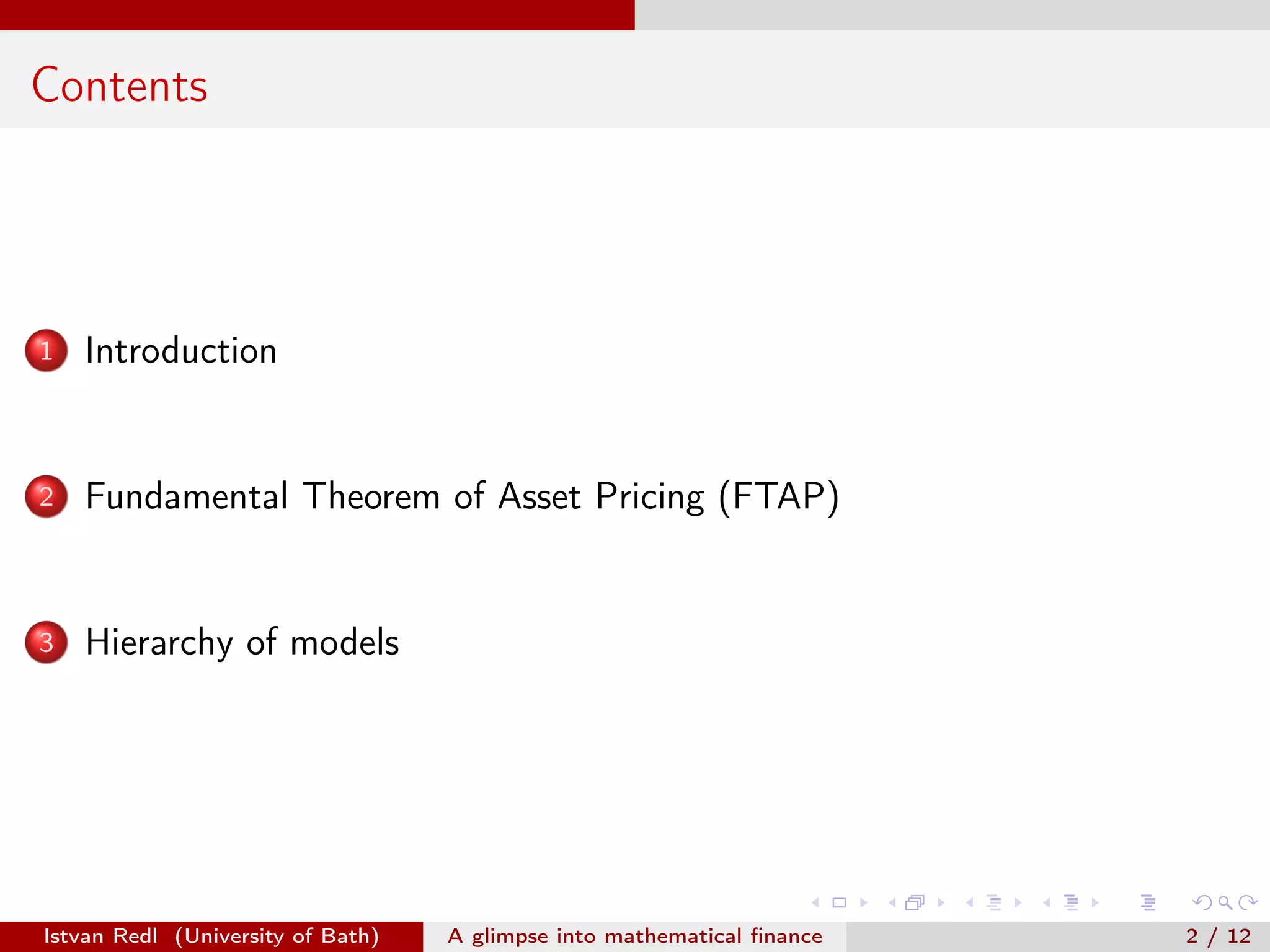 The document presents an overview of mathematical finance with a focus on option pricing models, highlighting its interdisciplinary nature and fundamental theorem of asset pricing (FTAP). It discusses the setup of financial markets, the concept of arbitrage opportunities, and introduces different modeling hierarchies including local and stochastic volatility models. The presentation concludes by inviting questions from the audience.