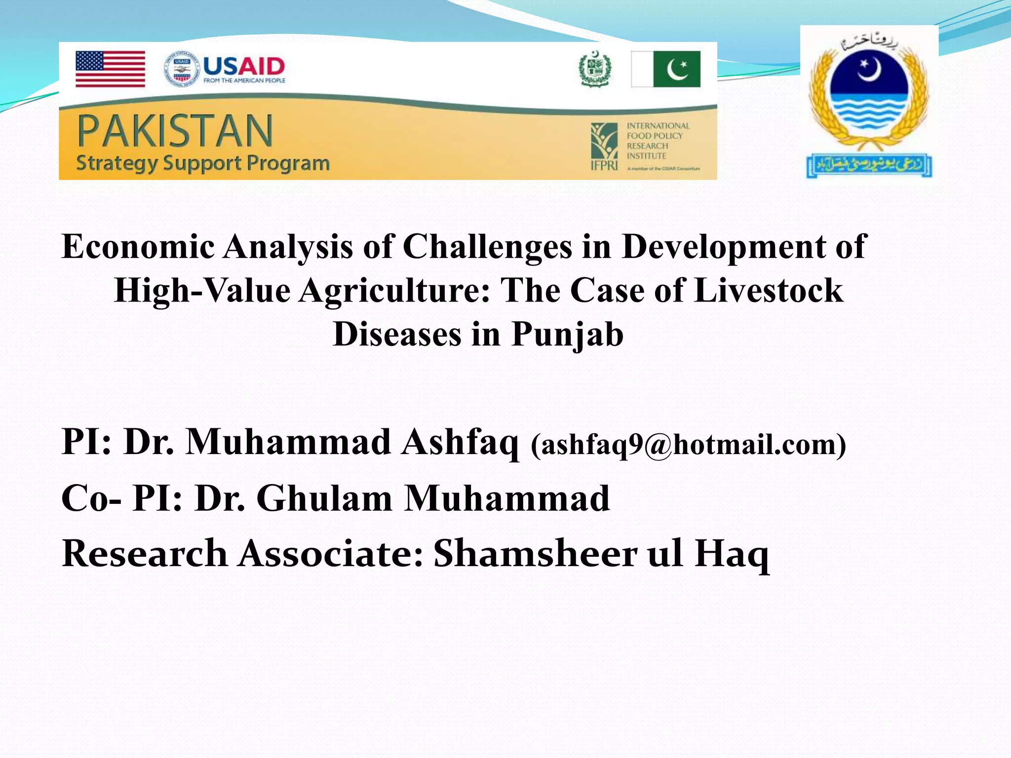 The document conducts an economic analysis of livestock diseases in Punjab, Pakistan, highlighting the significance of agriculture and livestock in the country's economy. It outlines the objectives and methodology for assessing the impact of diseases on livestock income and productivity, with plans for data analysis and report writing. Preliminary results indicate a distribution of livestock farmers into small, medium, and large categories, alongside socio-economic characteristics of respondents.