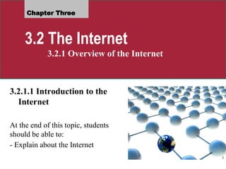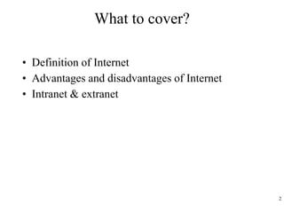 The document provides an overview of the Internet, including its definition, evolution, advantages, and disadvantages. It discusses different types of Internet connections such as dial-up, broadband, DSL, fiber, wireless, cable, Wi-Fi, and satellite. It also describes an Internet service provider's role in providing access to the Internet and lists some examples of ISPs in Malaysia. Finally, it defines Internet Protocol (IP) addresses and their relationship to domain names in allowing users to locate and identify computers on the network.