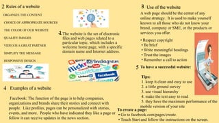 The document provides tips for designing an effective website. It recommends organizing content by topic, choosing appropriate sources, using quality images and video, simplifying the message, and creating a responsive design. An effective website makes the brand, company, products, or services known and includes meaningful headings, images, and a call to action. Creating a successful Facebook page involves following its instructions and keeping the page clean, easy to use, with visual hierarchy and optimized for mobile.
