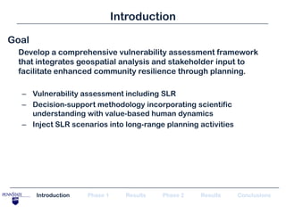 The document presents a comprehensive vulnerability assessment for Sarasota County, Florida, focusing on the impacts of hurricane storm surge and sea level rise through integrated geospatial analysis and community stakeholder input. Key results reveal population and infrastructure at risk in various surge categories, emphasizing the need for strategic urban planning and risk management to enhance community resilience. The study concludes with recommendations for development adjustments, infrastructure relocation, and improving preparedness among local businesses to mitigate future hurricane-related damages.