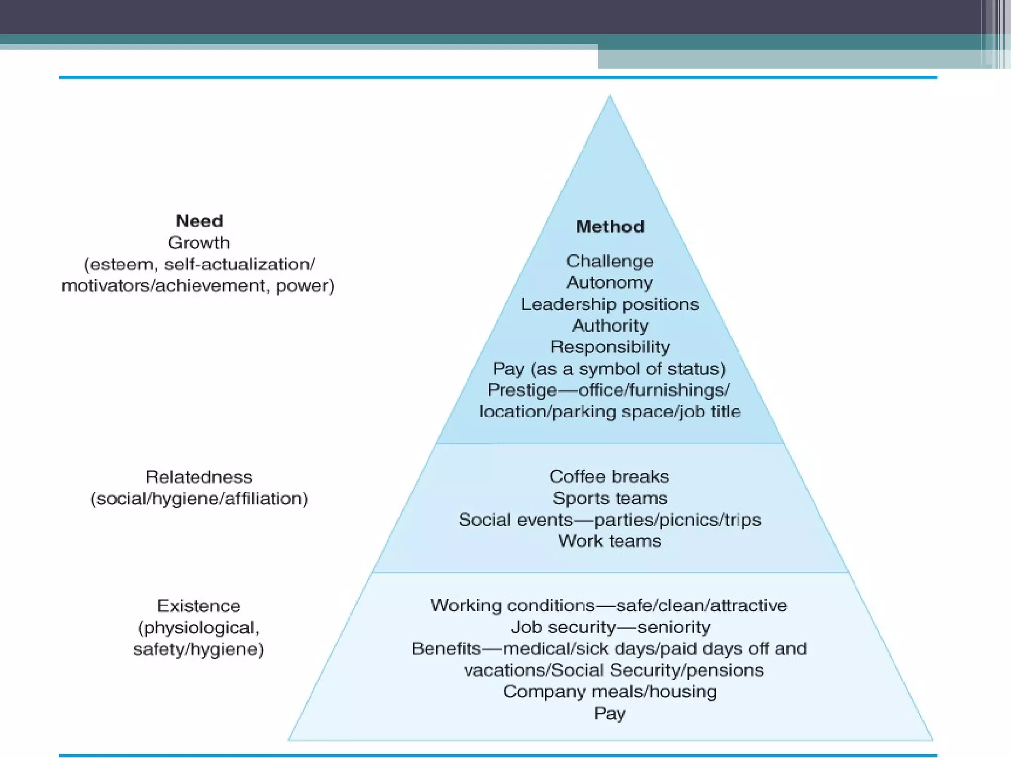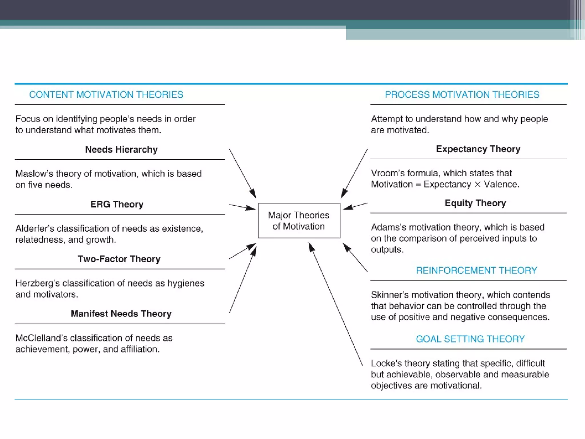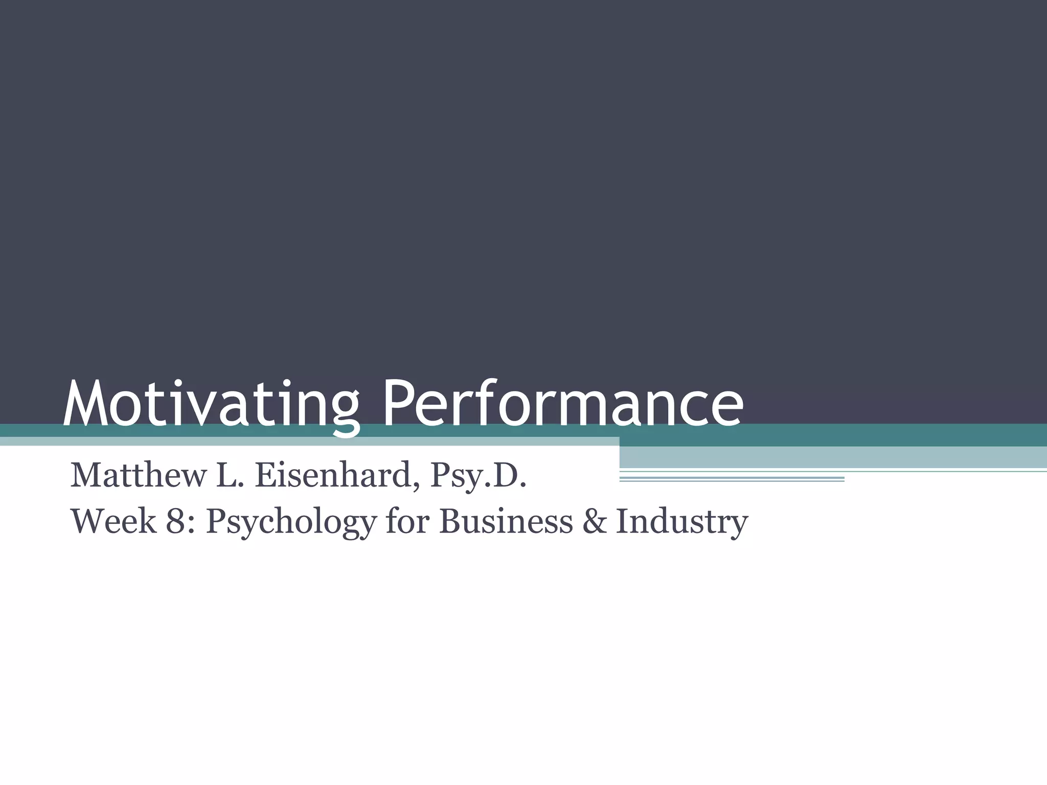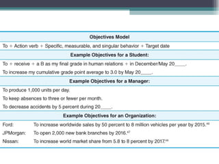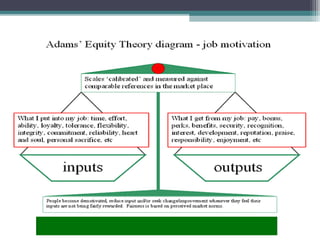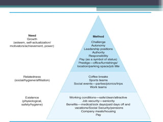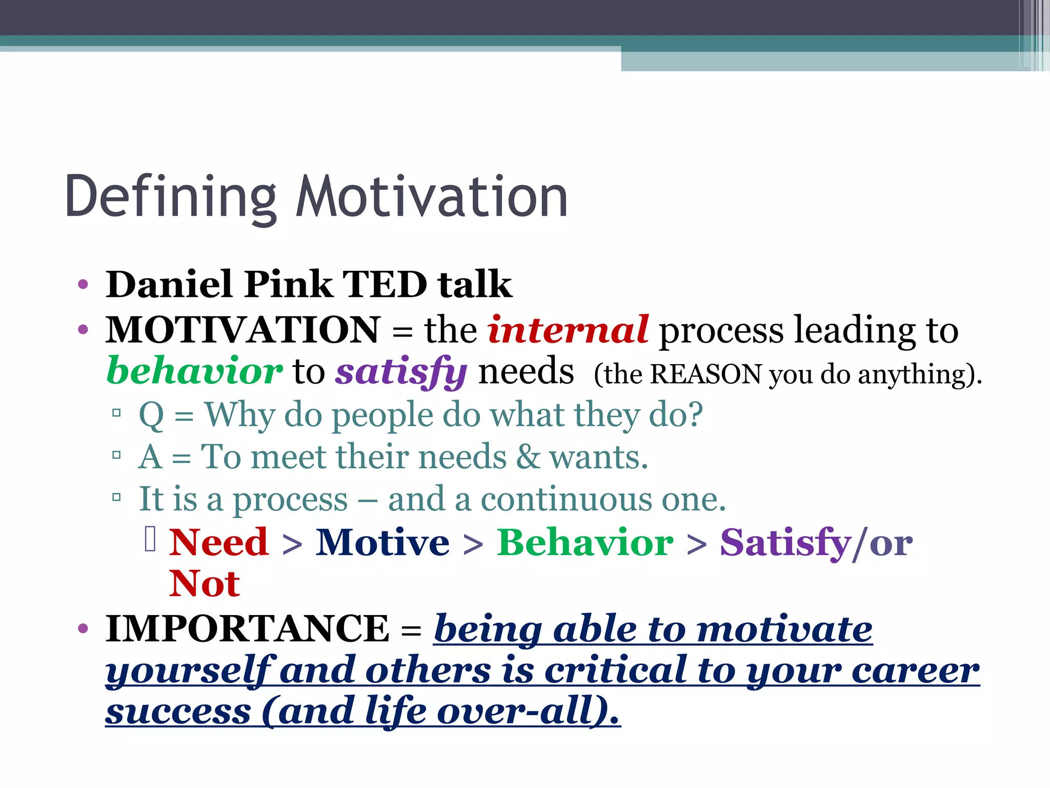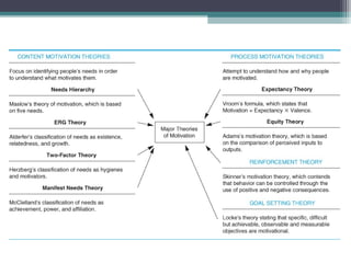 Motivation is the internal process leading to behavior to satisfy needs. Performance is determined by the formula: Performance = Ability x Motivation x Resources. There are several theories of motivation including: content theories like Maslow's hierarchy of needs and ERG theory that focus on identifying people's needs; process theories like expectancy theory that examine how motivation works; and reinforcement theories based on positive and negative consequences influencing behavior. Effective motivation techniques include setting objectives, job enrichment, praise, and management by objectives. Cross-cultural differences also impact motivation.