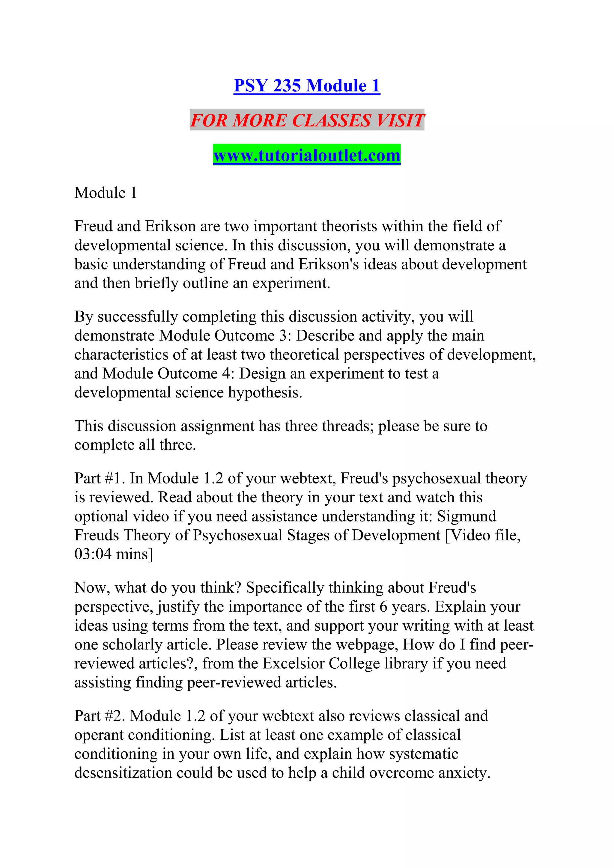 This document outlines a 3-part discussion assignment on developmental theories. Part 1 asks students to summarize Freud's psychosexual theory, justify the importance of the first 6 years, and support their response with scholarly sources. Part 2 requires students to provide examples of classical conditioning in their own lives, explain how systematic desensitization could help a child, and discuss an instance where punishment did not change their behavior. Part 3 instructs students to design an experimental study related to human development, addressing research problems, variables, hypotheses, methods, populations, procedures, potential results, and bias minimization.