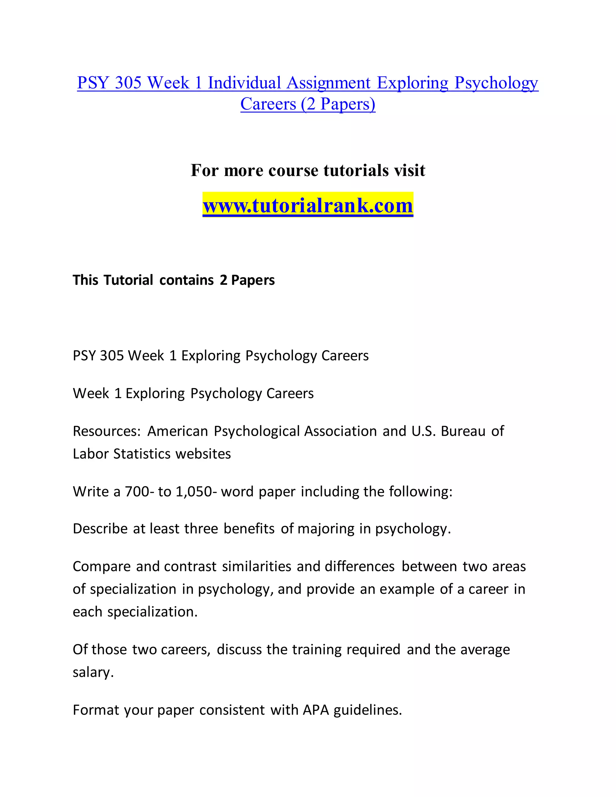 The document outlines various assignments for a psychology course (Psy 305) across several weeks, including papers and presentations focused on exploring psychology careers, APA guidelines, ethical principles, and confidentiality in therapeutic settings. It details specific tasks such as writing about the benefits of majoring in psychology, creating presentations on research processes, and discussing ethical considerations in psychology. Students are expected to format their work according to APA guidelines and include scholarly references.