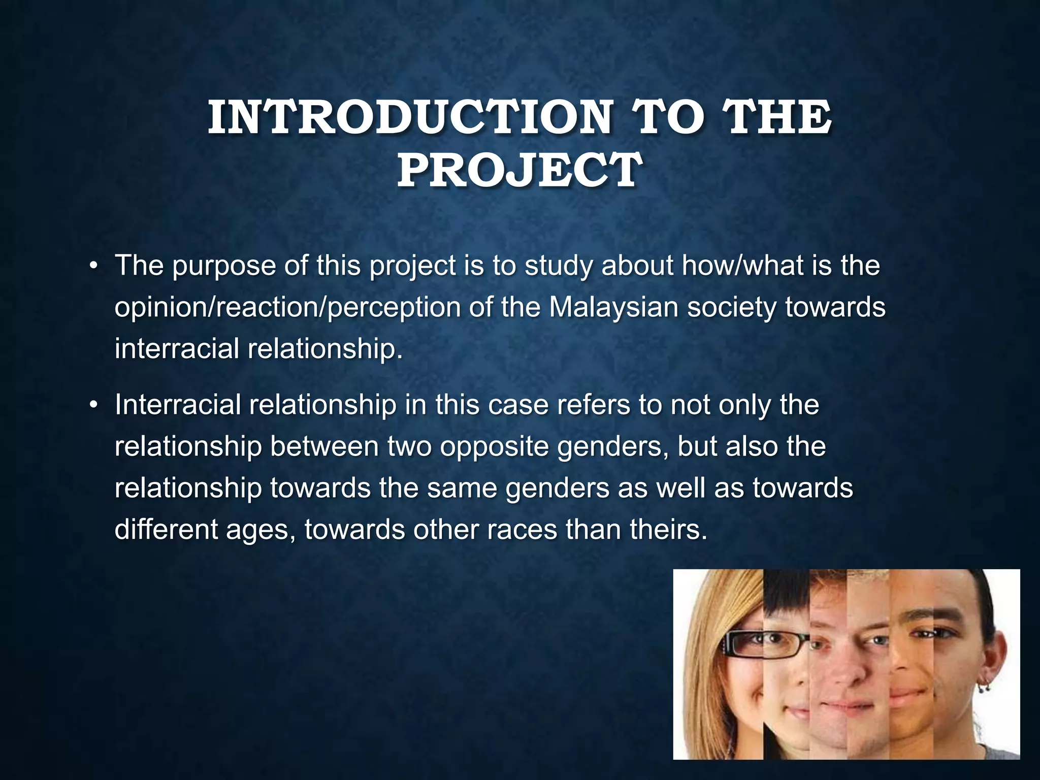 This document describes a study conducted to understand Malaysian perceptions of interracial relationships. The study used both quantitative and qualitative methods, including observing the races of people sitting together on trains and surveying participants about their preferences and social circles. The results found that most participants preferred to socialize and partner with others of their own race. The average participant was also single, between 19-24 years old, and had friends that were 95% of their own race.