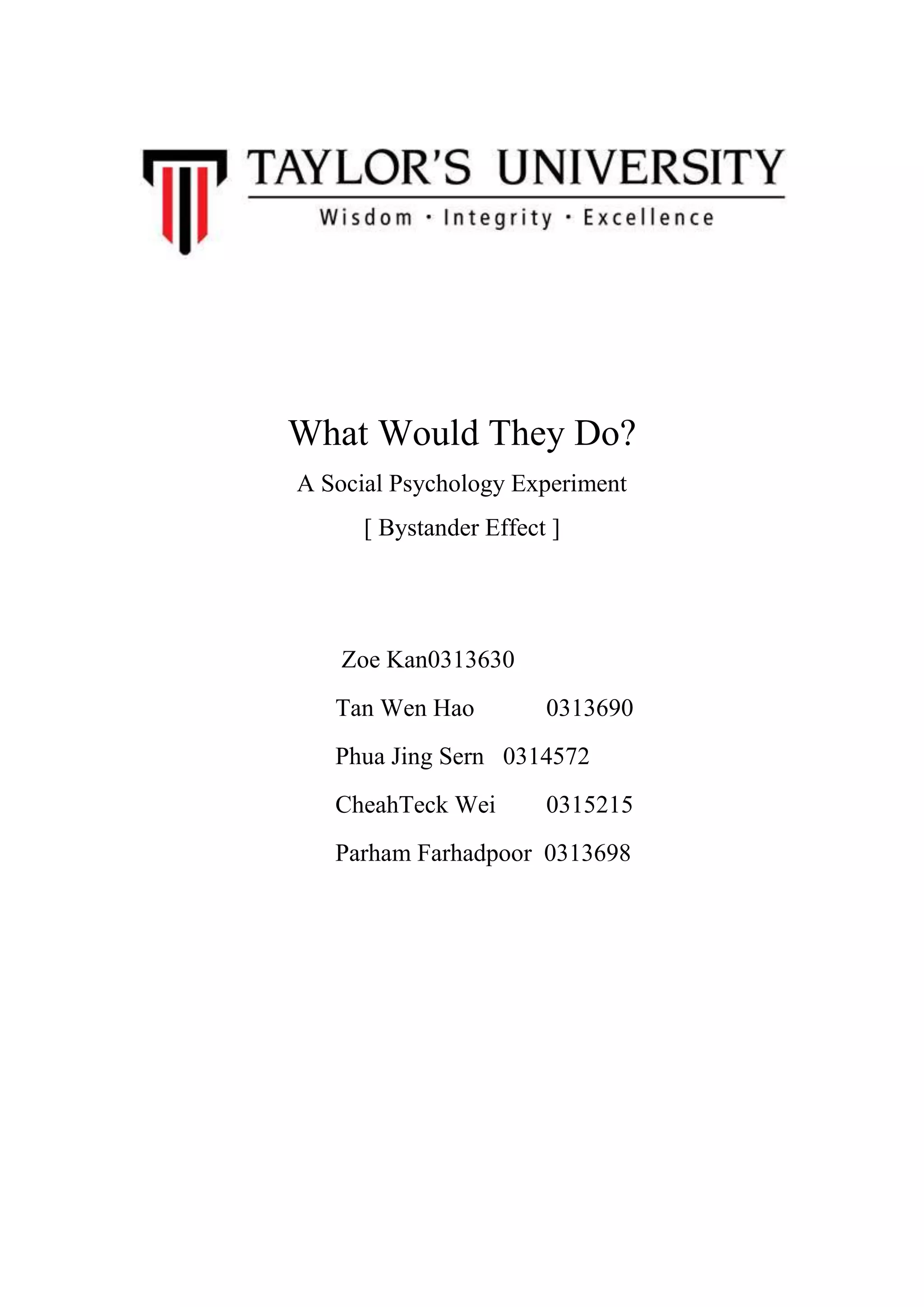 The document describes a study on the bystander effect conducted at Taylor's University. The study involved staging a laptop theft in public areas on campus and observing 127 participants' reactions. The results showed that females and individuals alone were more likely to notice the theft, with two females taking action. Those in groups were less likely to notice or help. The study supports the hypothesis that people are less likely to help when in a group than alone.