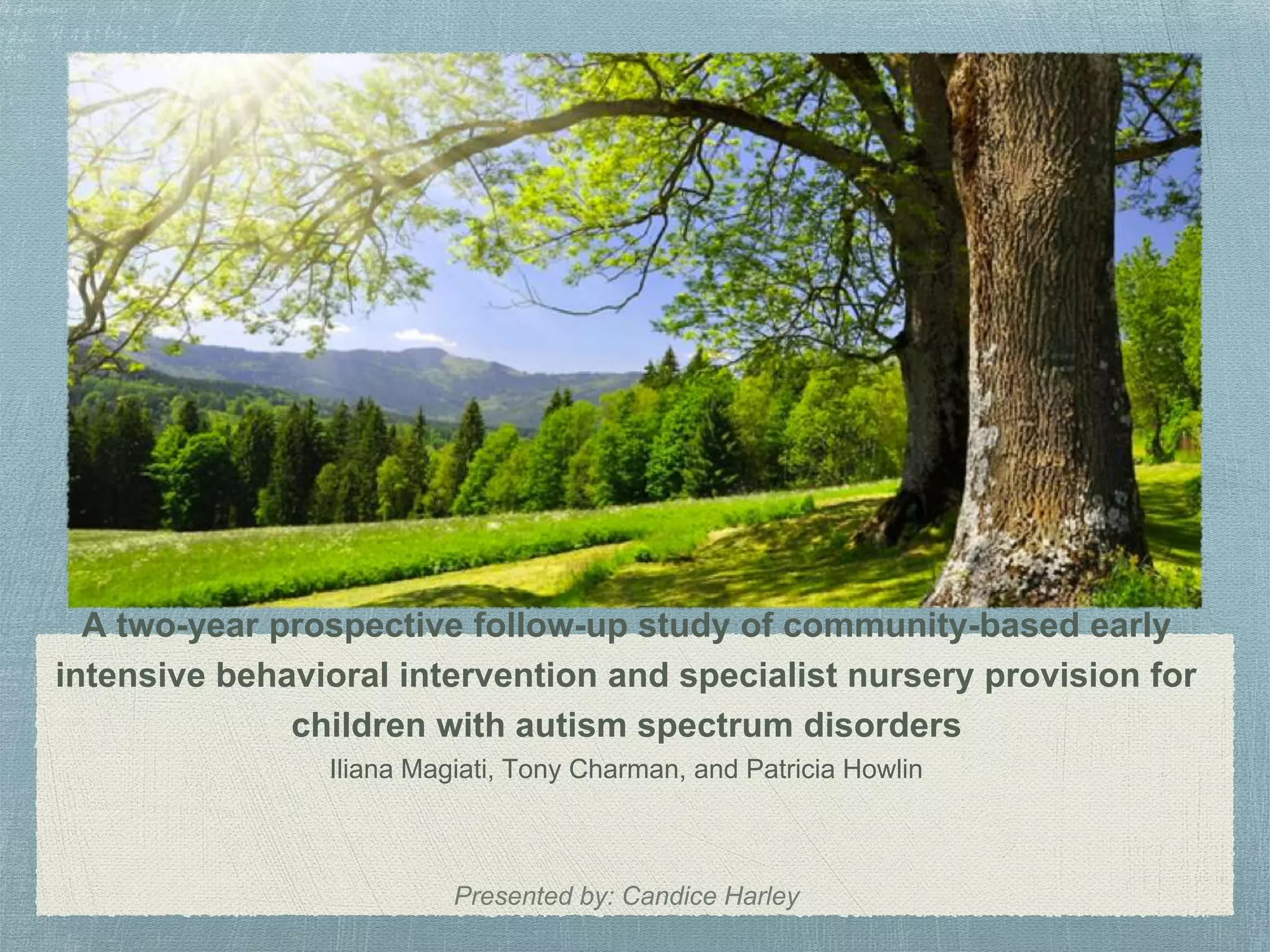 This study compared outcomes for 44 young children with autism who received either home-based early intensive behavioral intervention (EIBI) or autism-specific nursery provision over 2 years. Measures of IQ, language, play, adaptive behavior, and autism severity showed small to moderate improvements for most children in both groups, with no statistically significant differences between groups. The results did not support claims that EIBI leads to nearly half of children achieving normal functioning, and instead highlighted the heterogeneous nature and individual variability in outcomes for children with autism.