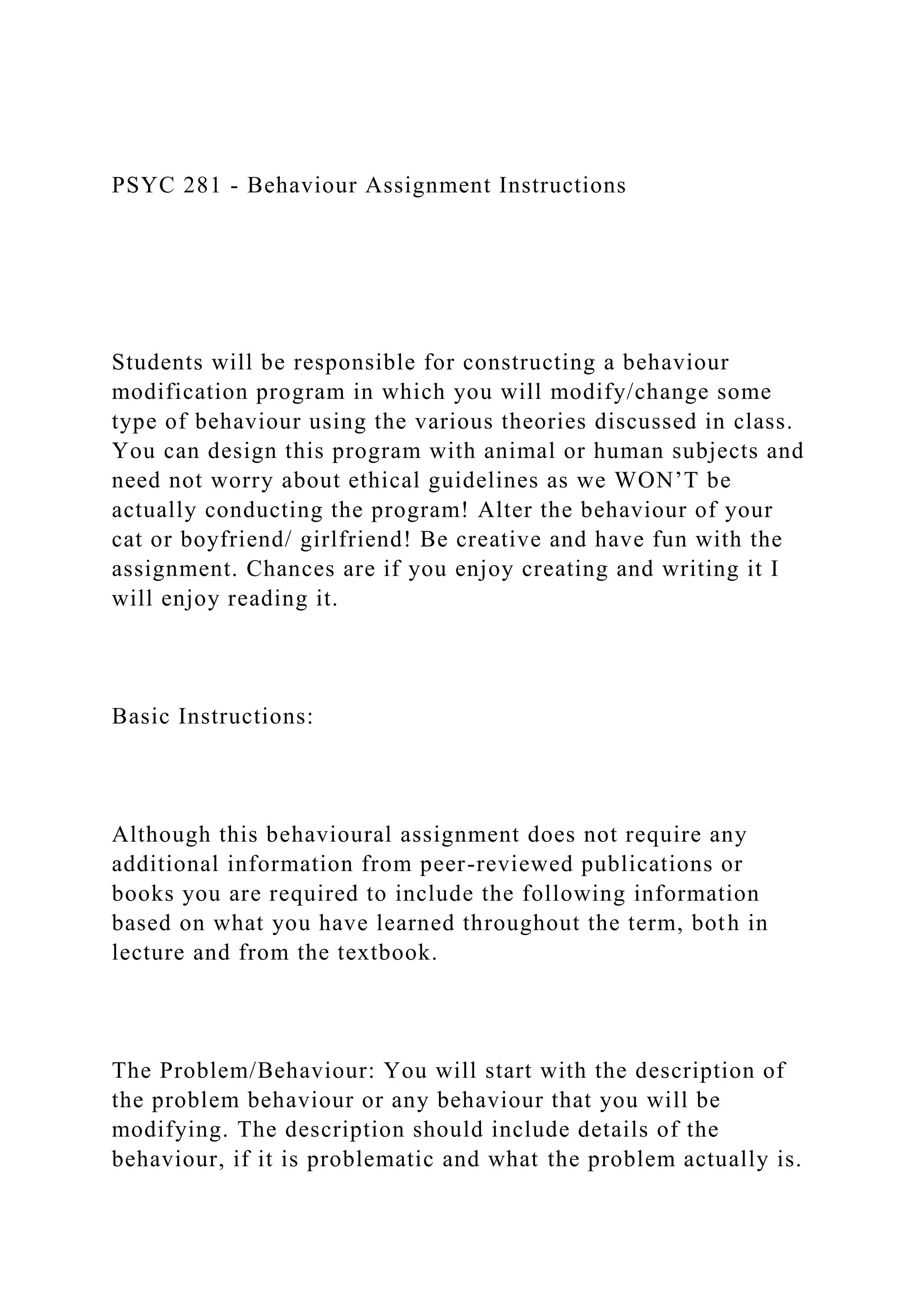 The document outlines an assignment for students in a psychology course to create a behavior modification program based on theories discussed in class, applying methods of classical and operant conditioning. Students must describe the target behavior, evaluate their progress, and link their program to appropriate behavioral theories while adhering to formatting guidelines. It also discusses ethical considerations in behavioral research and various research designs for measuring behavior.