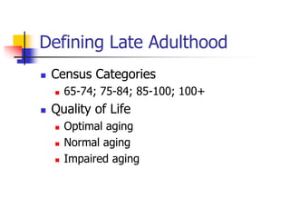The document discusses late adulthood, covering its definitions, age categories, and theories of aging, such as integrity vs. despair and activity theory. It explores health variations among the elderly, highlighting cognitive changes, aging phenomena, and the importance of distinguishing between primary and secondary aging. Additionally, it addresses social aspects like relationships, caregiving, and the challenges faced by the frail elderly, including issues of elderly abuse.