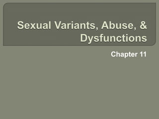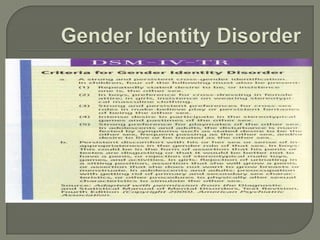 This document discusses the history of how homosexuality has been classified in the Diagnostic and Statistical Manual of Mental Disorders (DSM) from the first edition in 1952 to the fourth edition in 1994. It also examines various theories for the causal factors of homosexuality, including biological, genetic, prenatal influences, and psychosocial factors. Different psychological and biological treatment approaches are also mentioned, as well as topics relating to gender identity, sex, and sexuality.