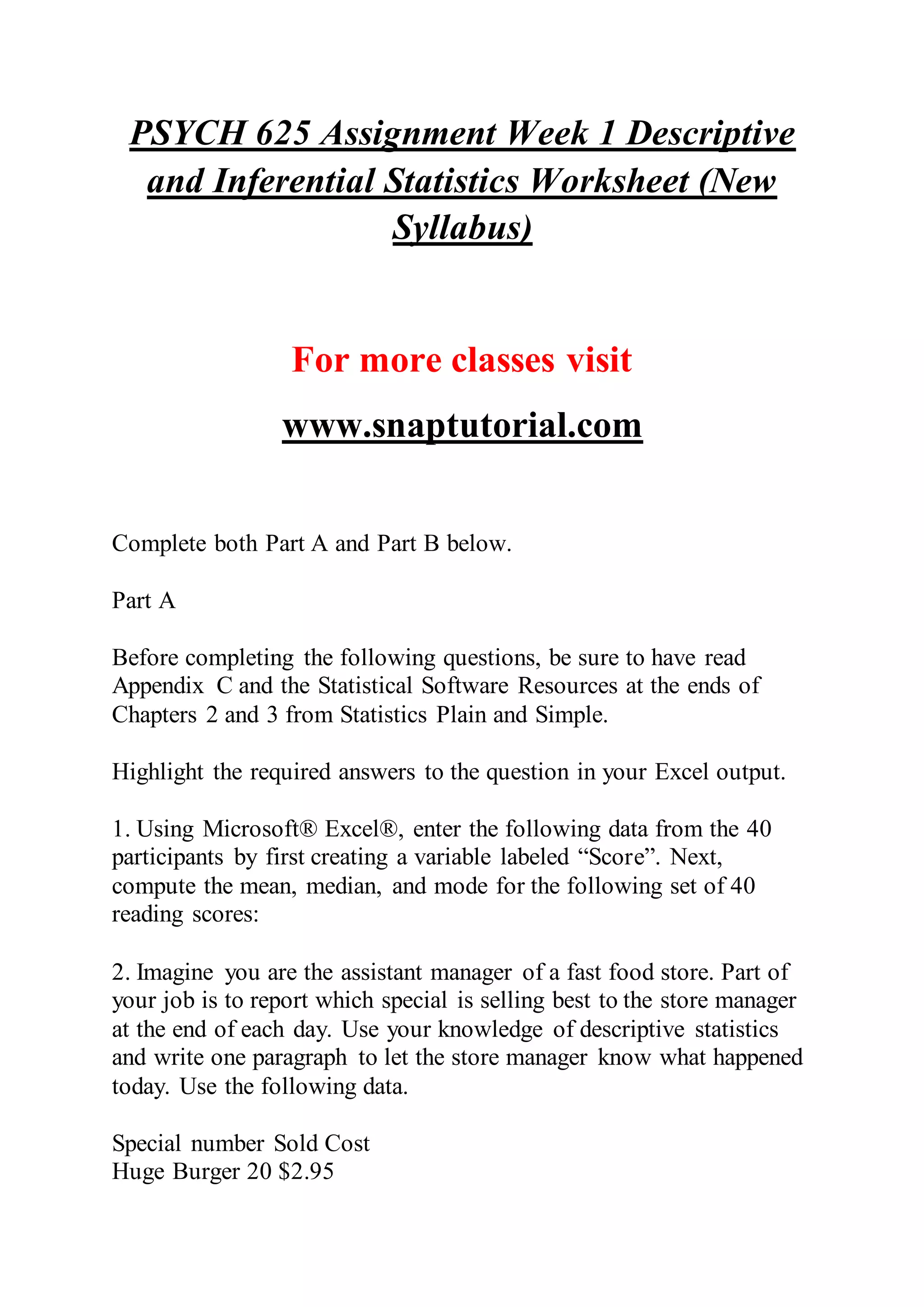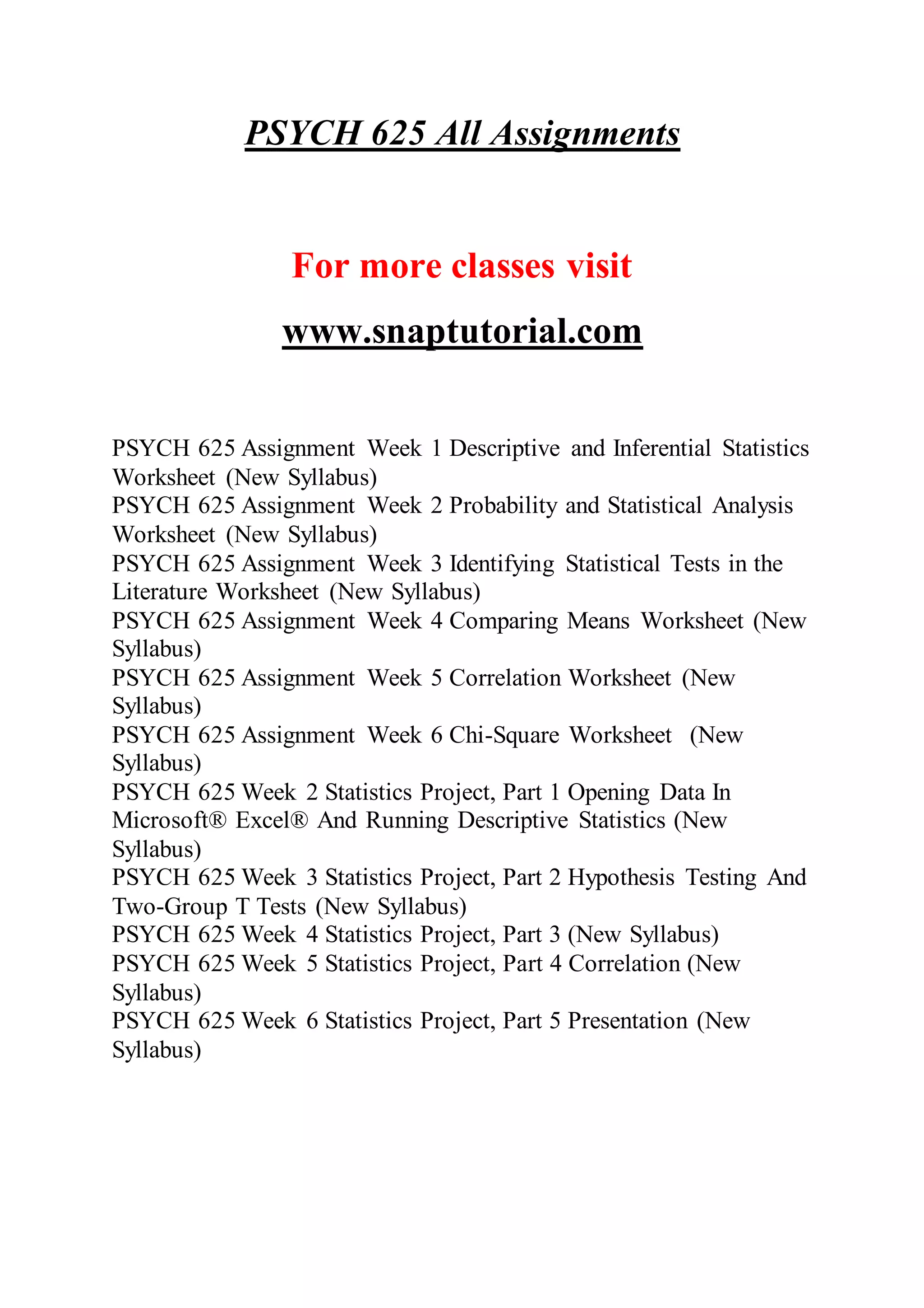 The document outlines multiple assignments for a statistics course (PSYCH 625), including worksheets and individual projects that cover topics such as descriptive and inferential statistics, probability analysis, hypothesis testing, correlation, and chi-square tests. Each week's assignment requires the use of Microsoft Excel for data analysis and encourages the application of statistical concepts through real-world examples and datasets. Additionally, the document details the overall structure of the course, encouraging students to engage with various statistical methods and reporting their findings accurately.