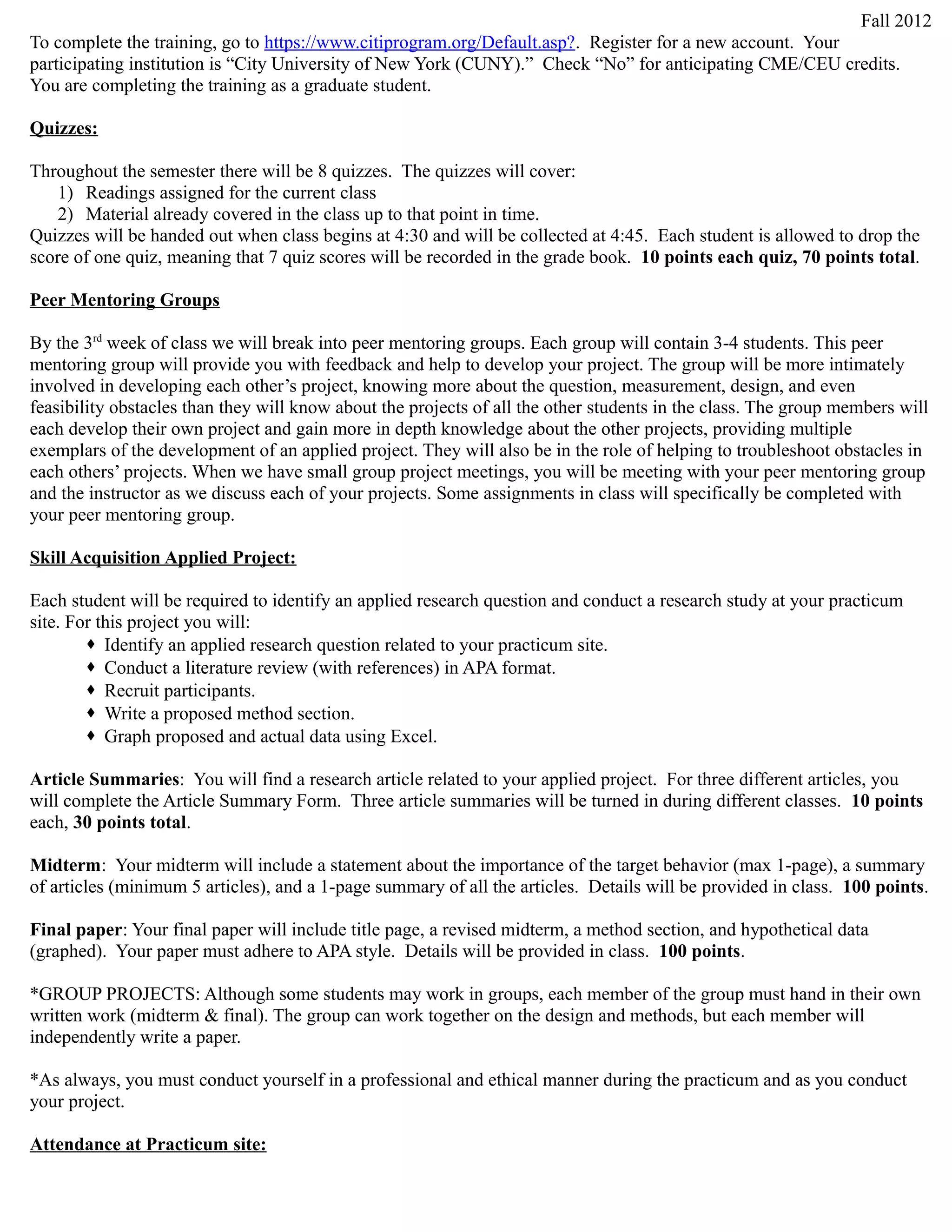 This document appears to be a syllabus for a graduate level course in applied behavior analysis. The main learning goals are to develop an applied research project targeting a socially important behavior. Students will operationally define behaviors, develop a measurement system, evaluate the effects of interventions, and write their projects using APA style. Assignments include quizzes, article summaries, a midterm describing their research topic and literature review, and a final paper including a method section and hypothetical data. Students must complete ethics training and find a practicum site to conduct their applied research project. The course meets weekly and includes small group meetings to provide feedback on students' projects.