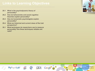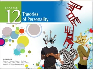 The document provides an overview of theories of personality from major perspectives in psychology, including psychodynamic, behavioral, humanistic, and trait theories. It discusses key concepts from each theory, such as Freud's psychosexual stages from the psychodynamic perspective, Bandura's social learning theory and reciprocal determinism from the behavioral view, Carl Rogers' ideas of self-concept and unconditional positive regard in humanism, and the Big Five model of traits. The document also covers assessment methods for personality, including interviews, projective tests, behavioral observations, and self-report inventories.