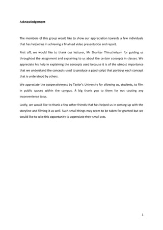 The document is a report on a group project to create a video portraying concepts from social psychology. It includes an acknowledgements section, table of contents, introduction, method, concept, and discussion sections. The summary is: