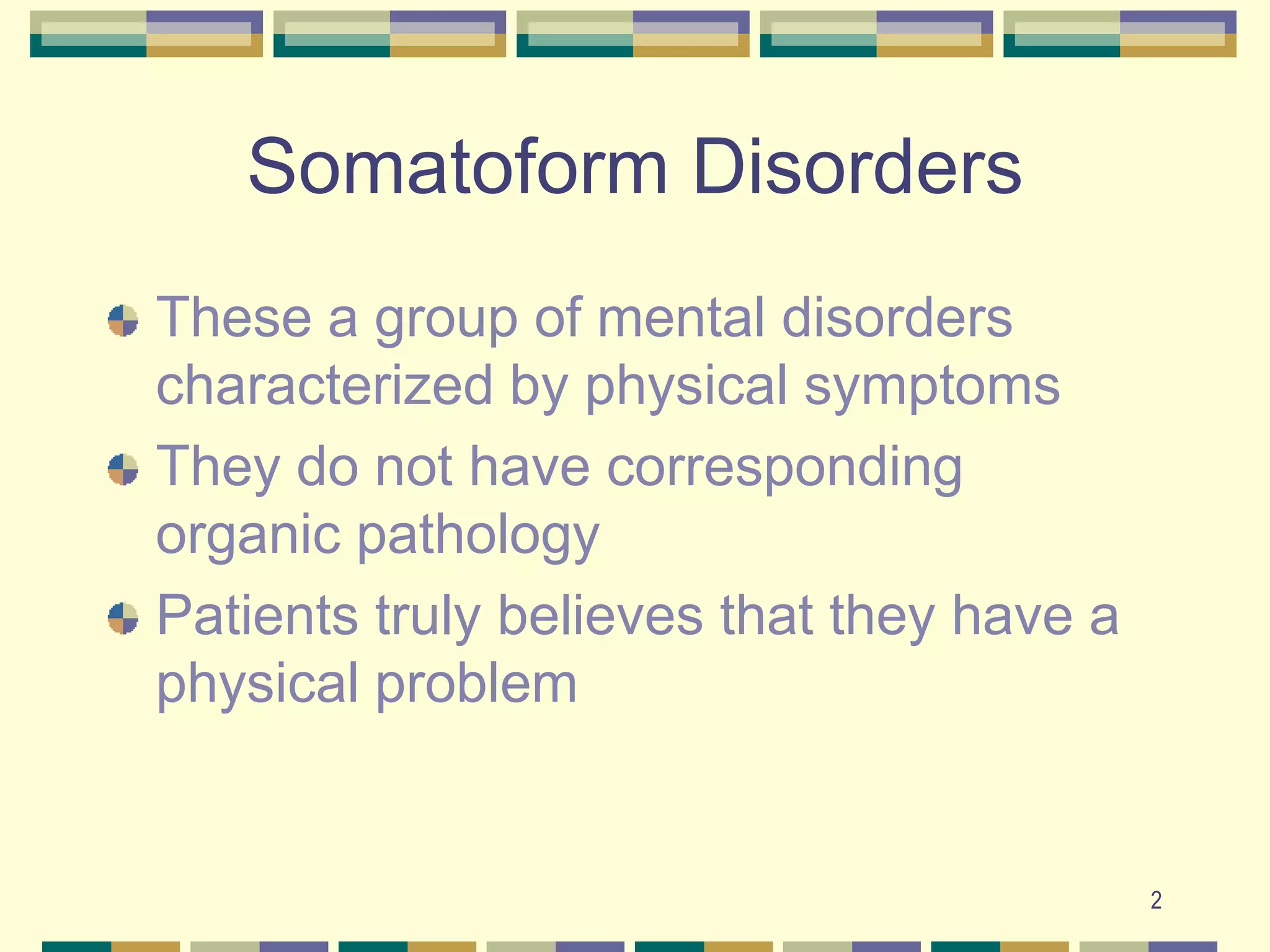 This document provides an overview of somatoform and dissociative disorders. It describes the major classifications in the DSM-IV including somatization disorder, conversion disorder, hypochondriasis, body dysmorphic disorder, pain disorder, and undifferentiated somatoform disorder. Key characteristics, differential diagnoses, treatments, and prognoses are outlined for each disorder. Paraphilias are also discussed including types such as pedophilia, voyeurism, and fetishism. Gender identity disorder and homosexuality are differentiated from paraphilias.
