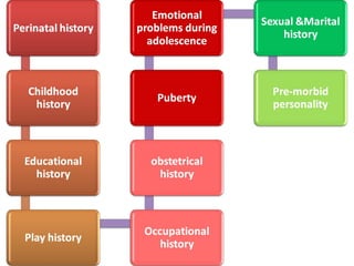 The document provides guidance on conducting a psychiatric history for patients. It discusses the importance of understanding a patient's life history and outlines key components to cover, including identification data, chief complaints, history of present illness, past medical/psychiatric history, family history, and personal history. Personal history should explore areas like childhood, education, relationships, and pre-illness personality. The goal is to understand the patient's experiences and diagnose and treat effectively.