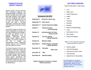 The Psychic Society of Toronto is a non-profit organization that has been providing free lectures and workshops on psychic and paranormal topics for over 30 years. The Society explores experiences like telepathy, clairvoyance, and precognition through monthly lectures given by scholars and professionals. It aims to understand these experiences and bring together a diverse community to discuss various viewpoints. Some of the lecturers featured in the upcoming fall season include experts on pendulum power, tarot reading, tea cup reading, palmistry, and crystal healing.
