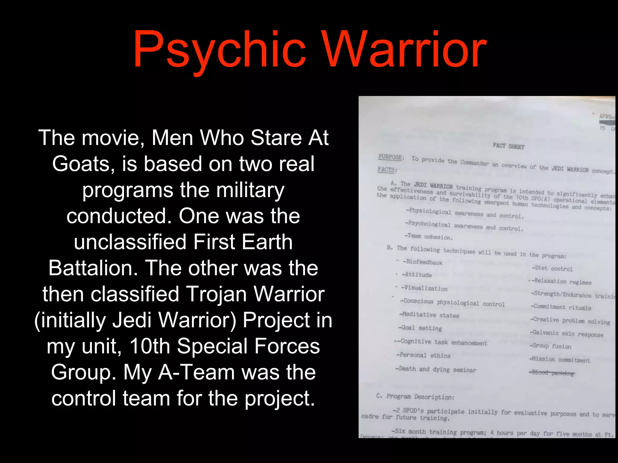 The document discusses the real military programs that inspired the film 'Men Who Stare at Goats', specifically the unclassified First Earth Battalion and the classified Trojan Warrior project. It outlines a fictional narrative where psychic warfare leads to a race against time to recover stolen nuclear warheads and defeat a supernatural entity named Chyort. The author, a former Green Beret and West Point graduate, has published over 80 books and is well-versed in military operations and training.