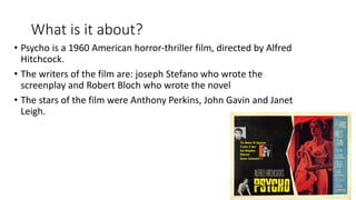 Psycho is a 1960 horror film directed by Alfred Hitchcock, based on the novel by Robert Bloch. It tells the story of Marion Crane, who is murdered by Norman Bates after stealing money at a motel he owns. The film is known for its innovative editing techniques and shocking shower scene murder of the main character. Hitchcock aimed to subvert audience expectations through twists and surprises, most notably killing off the main character early in the film. The film was a major box office success and is considered one of the most influential films in the horror genre.