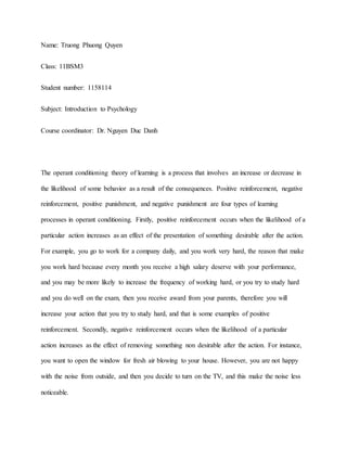 This document provides an introduction to operant conditioning theory and its four types of learning processes. It discusses positive reinforcement as increasing a behavior when something desirable follows it, like receiving a high salary for working hard. Negative reinforcement is also explained as increasing a behavior to remove something undesirable, like turning on a TV to reduce noise from an open window. The full document analyzes two of the four operant conditioning processes.