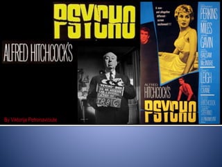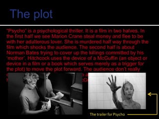 This document provides an analysis of the 1960 Alfred Hitchcock film "Psycho". It summarizes that the film tells the story of Marion Crane who steals money and is murdered halfway through the film. The second half follows Norman Bates trying to cover up the killings committed by his mother. It notes that Hitchcock uses suspense, red herrings, and cliffhangers as common thriller techniques in the film. It also discusses the famous shower scene murder of Janet Leigh's character Marion Crane as being shocking for its time due to its editing and soundtrack.
