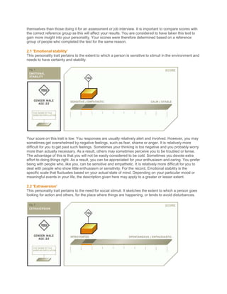 This document summarizes a personality test report in four sections. Section one explains the theoretical background of the Big Five personality traits tested (Emotional stability, Extraversion, Conscientiousness, Agreeableness, Openness). Section two describes the test-taker's scores on each trait. Section three reviews how combinations of trait scores may indicate additional key personality types. Section four concludes that personality traits provide a vocabulary for self-reflection rather than a complete judgment.