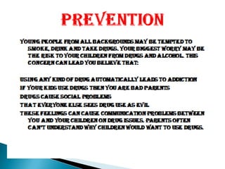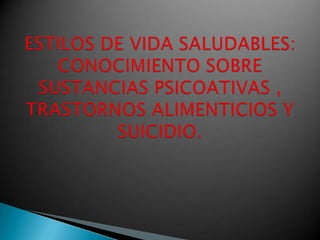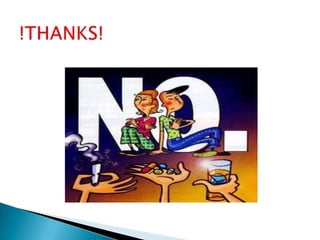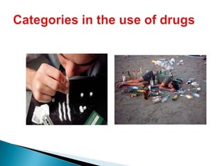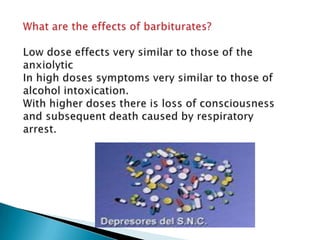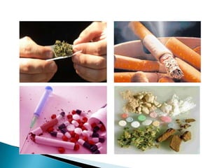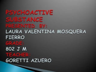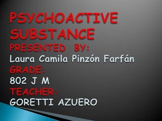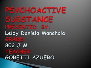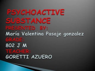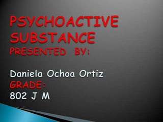 The document discusses psychoactive substances and their effects. It describes that psychoactive substances are capable of altering normal brain function and consciousness by interacting with the central nervous system. It categorizes psychoactive drugs into four main types: depressants, stimulants, opioids, and hallucinogens. Depressants like alcohol and benzodiazepines slow brain activity while stimulants like cocaine and amphetamines increase it. Opioids relieve pain by interacting with opioid receptors. Hallucinogens alter cognition and perception. The document provides examples of commonly used psychoactive substances and their origins and effects.