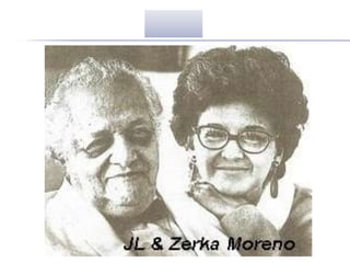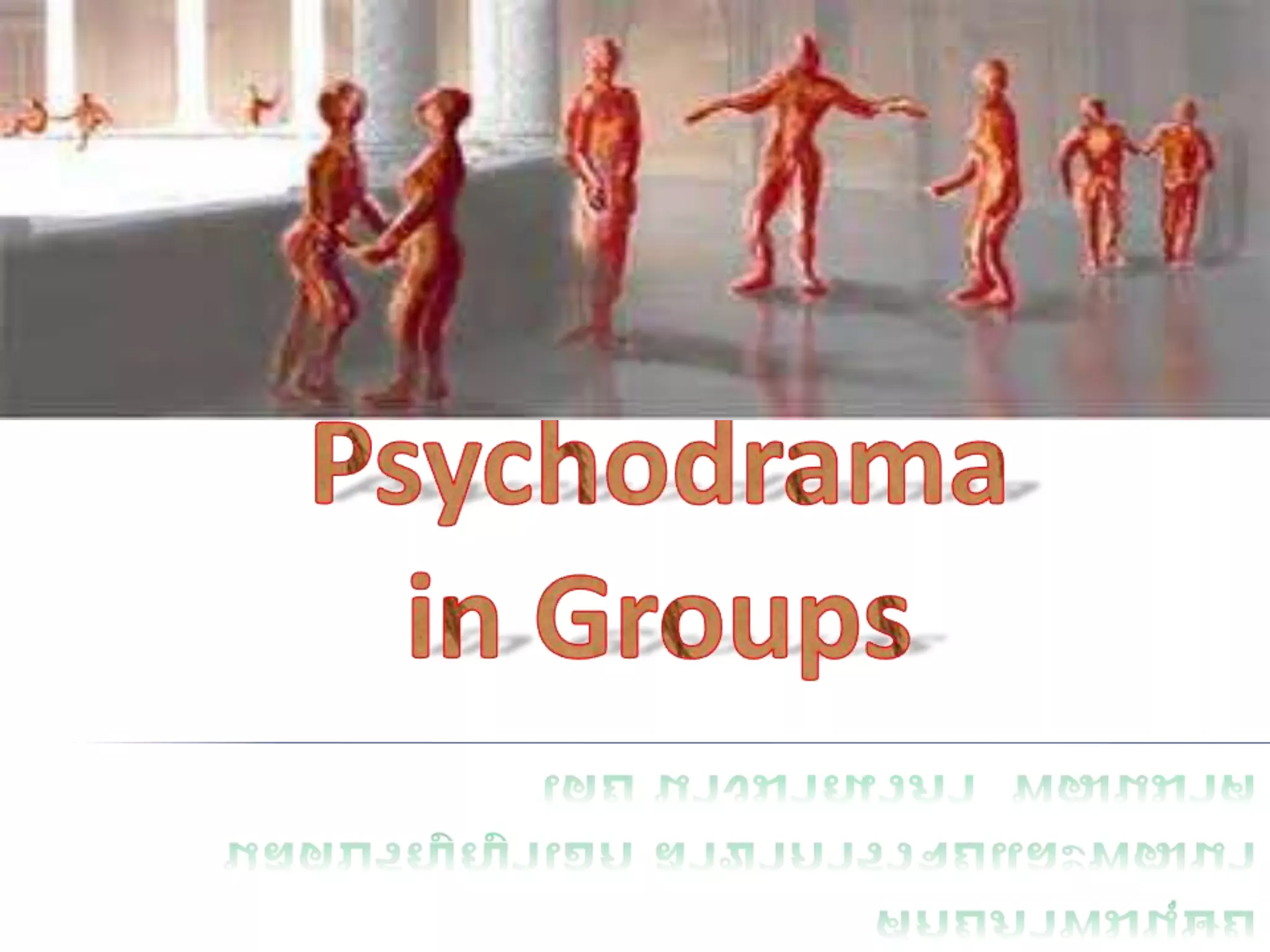 This document discusses psychodrama, a therapeutic technique where participants enact scenarios from their lives. Psychodrama uses spontaneity, creativity, and role-playing to help clients gain insight. It involves a protagonist, auxiliary egos to fill other roles, an audience, and a director. Sessions proceed through warm-up, action, and sharing phases. Common techniques include role reversal, doubling, the empty chair method, and future projections. The document also explores applying psychodrama to groups, multicultural settings, and integrating it with other therapeutic approaches.