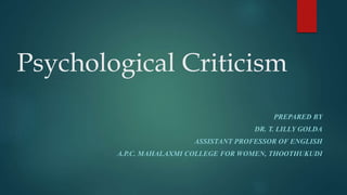 The document discusses psychology as a field focused on understanding the human mind and behavior through various theories and contributions, particularly by Freud and others. It highlights the impact of psychological concepts on literature and criticism, addressing figures such as Adler and Jung, and their influence on literary naturalism and character analysis. Additionally, it critiques the limitations of the psychological approach in artistic interpretation, emphasizing oversimplification and the distinction between art and dreams.