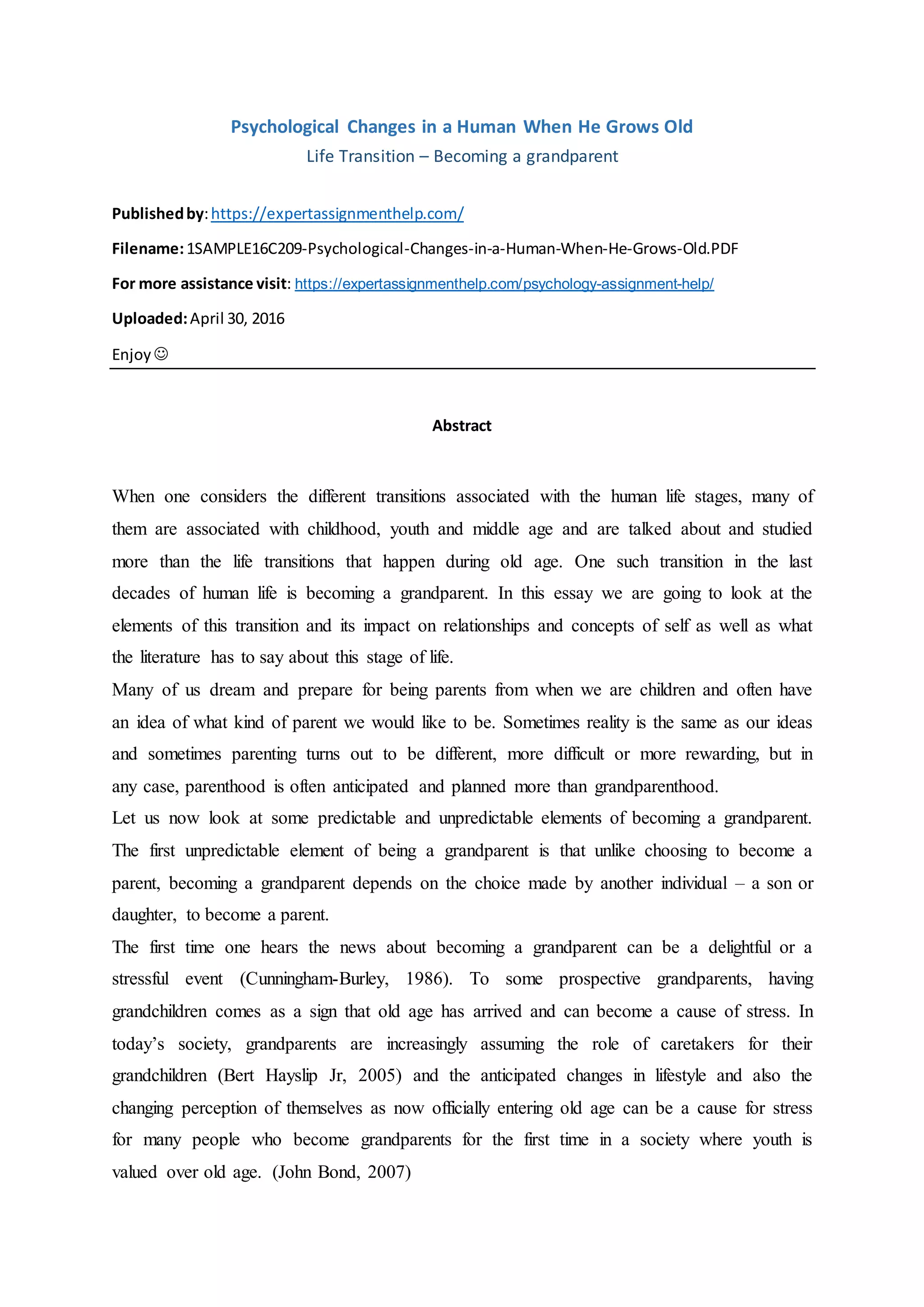 The document discusses the psychological changes individuals experience as they transition into grandparenthood, a life stage often less studied compared to earlier stages like childhood and parenthood. It highlights how becoming a grandparent can be both joyful and stressful, depending on individual circumstances and societal perceptions of aging. The essay also notes that grandparents increasingly take on caregiver roles, which can further impact their self-concept and lifestyle.