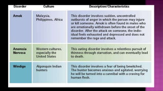 Psychological disorders can be understood from biological, psychological, and socio-cultural perspectives. They are classified in the DSM and include anxiety disorders like generalized anxiety disorder, panic disorder, and PTSD. Mood disorders involve disturbances in mood like depression and bipolar disorder. Schizophrenia impacts thinking, perception, communication and behavior with symptoms like delusions and hallucinations. Personality disorders are chronic maladaptive patterns grouped into odd/eccentric, dramatic/emotionally problematic, and chronic fearfulness clusters which include paranoid, antisocial, avoidant, and obsessive-compulsive types.